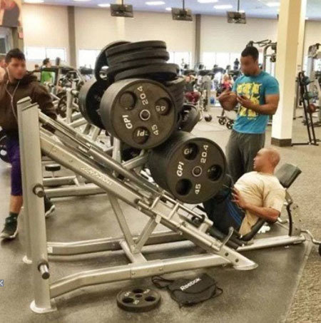 사진 속 남성은 헬스장에서 바벨을 산처럼 쌓아두고 이를 이용해 하체 운동을 하고 있다.