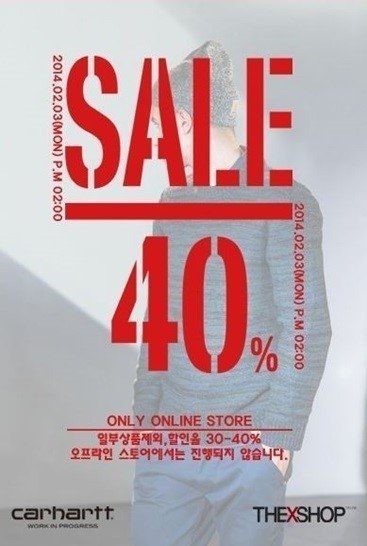 칼하트는 3일 오전 11시부터 F/W 시즌 오프를 맞아 세일 행사를 실시했다. 온라인 스토어에 한해서 의류와 구두 모자 여행용 가방 등에 대해 최대 40%까지 할인이 적용된다.