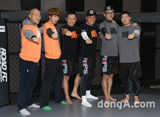 육진수(왼쪽부터), 뮤지, 서두원, 이훈, 윤형빈, 남의철이 3일 오후 서울 강남구 서두원 GYM에서 열린 케이블채널 XTM ‘주먹이 운다- 영웅의 탄생’(이하 ‘주먹이 운다’) 공동인터뷰에서 포토타임을 하고 있다.