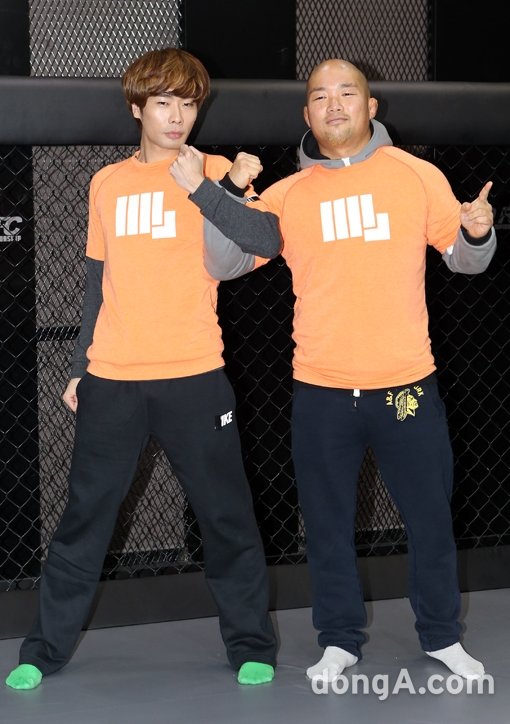 뮤지(왼쪽)와 육진수가 3일 오후 서울 강남구 서두원 GYM에서 열린 케이블채널 XTM ‘주먹이 운다- 영웅의 탄생’(이하 ‘주먹이 운다’) 공동인터뷰에서 포토타임을 하고 있다.