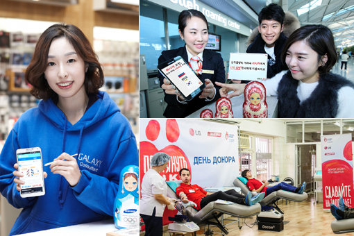 지구촌 축제 ‘소치 동계올림픽’을 앞두고 국내 주요 IT 기업들이 프로모션에 열을 올리고 있다. 대회 공식 후원사 삼성전자가 내놓은 ‘삼성 와우’ 애플리케이션과 KT가 러시아 현지 공식 이동통신사업자 ‘메가폰’과 제휴를 통해 제공하는 LTE 로밍 서비스, LG전자가 최근 러시아 소치에서 펼친 대규모 헌혈캠페인.(왼쪽부터 시계방향으로) 사진제공|삼성전자·LG전자·KT