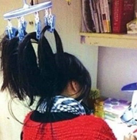 사진 속 여성은 빨래 집게들로 머리카락을 고정한 채 공부에 열중하고 있어 보는 이들의 시선을 사로잡았다.