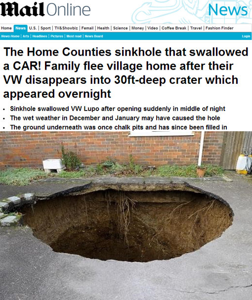 지난 2일(현지시간) 영국 일간 ‘데일리메일’은 이와 같이 보도했다. 기사에 따르면, 잉글랜드 중남부 버킹엄셔에 거주하는 조이 스미스는 집 앞에 차를 세워뒀다. 그러나 그의 자동차는 하룻밤 사이 생겨난 폭 4m, 깊이 10m의 싱크홀로 사라져버렸다.