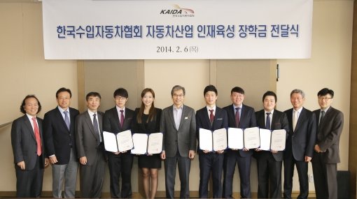 한국수입자동차협회(www.kaida.co.kr, 회장 정재희)는 6일(목) 서울 중구에 위치한 서울프라자호텔에서 ‘KAIDA 자동차산업 인재육성 프로그램’의 일환으로 국내 3개 자동차공학 대학원(국민대, 연세대, 한양대) 대학원생 5명에게 장학금을 전달했다. 이날 행사에는 한국수입자동차협회 정재희 회장, 국민대 허승진 교수, 연세대 전광민 교수, 한양대 선우명호 교수, 한양대 허건수 교수 및 수상자들이 참석했다.