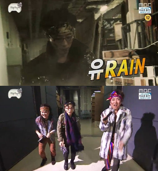 이날 방송에서 유재석, 박명수, 조세호는 비의 무대의상을 따라 입고 음악에 맞춰 춤을 추며 등장했다. 세 사람은 머리띠와 입술 마크까지 따라했다.