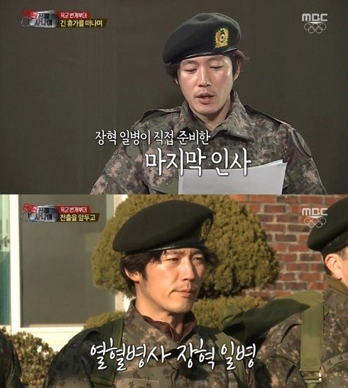 이날 방송에서 장혁은 “인생의 전환점을 찾기 위해 군대에 다시 입대했다. 새로운 전우들을 만나고 그들의 땀냄새를 맡으며 우리의 군생활은 현실이 돼갔다”고 하차 소감을 전했다.