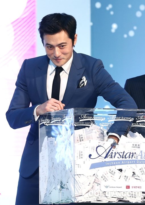 배우 장동건이 10일 오후 인천국제공항에서 열린 경품추첨식에서 추첨을 하고 있다.