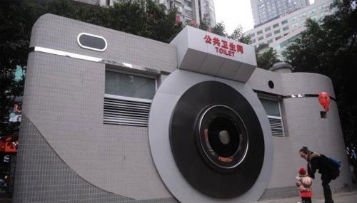사진 속 화장실은 중국의 한 도시에 설치된 화장실이다. 인근에 있는 대형 디지털기기 상가를 홍보하기 위해 디자인된 것으로 알려졌다. 거대한 카메라 같은 독특한 외관이 인상적이다.