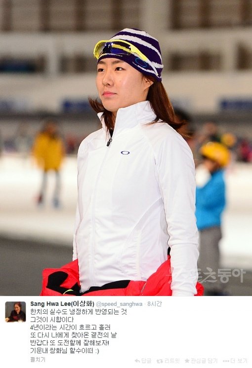 이상화는 11일(이하 한국시각) 자신의 트위터에 “한치의 실수도 냉정하게 반영되는 것 그것이 시합이다. 4년이라는 시간이 흐르고 흘러 또 다시 나에게 찾아온 결전의 날. 반갑다 또 도전할게. 잘해보자! 기운 내 상화 님 할 수 있어”라는 글을 남기며 각오를 다졌다.