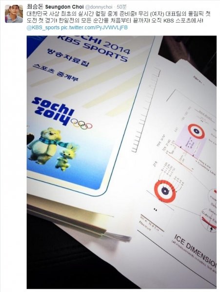 최승돈 아나운서는 11일(이하 한국시각) 자신의 트위터에 “대한민국 사상 최초의 실시간 컬링 중계 준비중! 우리 (여자) 대표팀의 올림픽 첫 도전 첫 경기! 한일전의 모든 순간을 처음부터 끝까지!”라는 글과 함께 중계 자료집 모습이 담긴 사진을 게재했다.