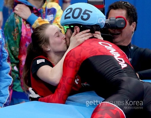 캐나다의 샤를 아믈랭(오른쪽)이 10일(한국시간) 벌어진 2014소치동계올림픽 쇼트트랙 남자 1500m 결승에서 1위를 차지한 뒤 경기를 지켜보던 연인 마리안 생젤라에게 달려가 키스하고 있다. 사진=GettyImages/멀티비츠