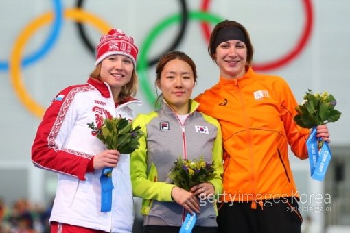 경기 후 이상화는 2위 올가 팟쿨리나(러시아·75초06)와 3위 마르곳 부르(네덜란드·75초48)와 함께 시상대에 올라섰다. 하지만 메달은 보이지 않았고 3명의 선수들은 축하 꽃다발만을 받은 채 포즈를 취한 뒤 시상대를 내려왔다.