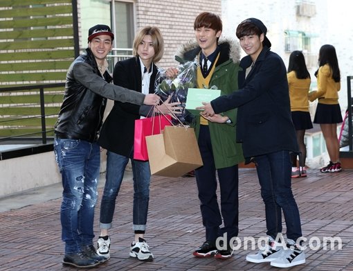 그룹 뉴이스트가 13일 오전 서울 구로구 서울공연예술고등학교에서 열린.‘2014학년도 서울공연예술고등학교 졸업식’에서 포즈를 취하고 있다.
