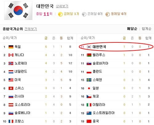 아직까지 한국 선수단은 지난 12일 ‘빙속 여제’ 이상화(25·서울시청)가 스피드스케이팅 여자 500m에서 획득한 금메달이 이번 소치 올림픽에서 얻은 유일한 메달이다. 한국은 이상화의 금메달로 한때 9위까지 순위가 상승했지만 이후 노 메달에 그치며 11위로 하락했다.