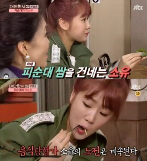 피순대의 비주얼에 질색한 정훈희 김태화와 달리 소유는 피순대를 쌈싸 야무지게 먹었다. 이어 암뽕이라 불리는 돼지 아기집 요리에도 도전해 놀라움을 자아냈다.