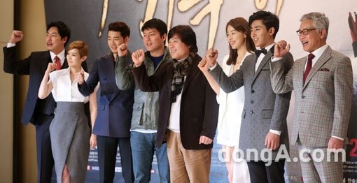 배우 조진웅, 김유리, 윤계상, 감독 김정현, 배경수, 한지혜, 손호준, 김영철(왼쪽부터)이 13일 오후 서울 영등포구 타임스퀘어 아모리스홀에서 열린 KBS 월화드라마 ‘태양은 가득히’ 제작발표회에 참석해 포토타임을 하고 있다.