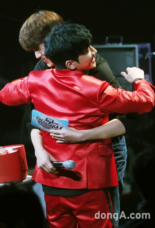 가수 M(이민우)이 13일 오후 서울 마포구 CJ E&M에서 열린 Mnet 엠카운트다운에서 김우빈을 포옹하고 있다. 이날, 김우빈은 마지막 방송을 진행했다.