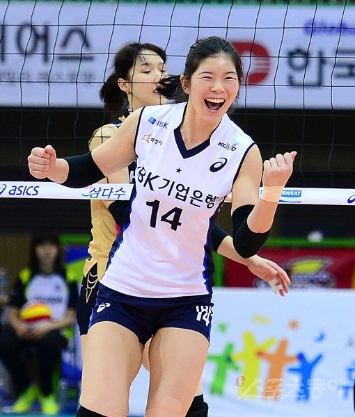 기업은행 센터 유희옥(14번)이 손가락 부상을 딛고 출전한 12일 GS칼텍스와 경기에서 유효블로킹 7개를 기록하며 팀 승리에 힘을 보탰다. 스포츠동아DB