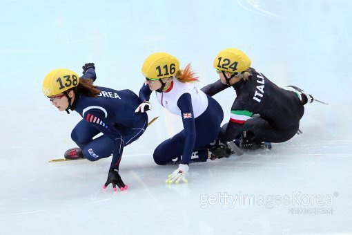 박승희(22·화성시청)가 13일(이하 한국시간) 러시아 소치의 아이스버그 스케이팅 팰리스에서 펼쳐진 여자 쇼트트랙 500m 결승에서 영국의 엘리스 크리스티에게 밀리고 있다.