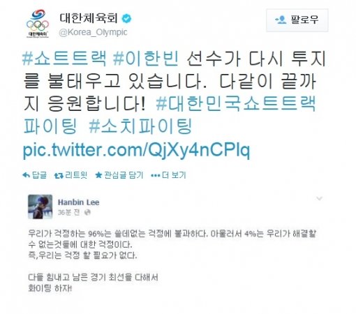 대한체육회 트위터에는 14일(이하 한국시각) “쇼트트랙 이한빈 선수가 다시 투지를 불태우고 있습니다. 다같이 끝까지 응원합니다. 대한민국 쇼트트랙 파이팅, 소치 파이팅”이라는 글과 함께 이한빈 SNS를 캡처한 사진 한 장이 게재됐다.