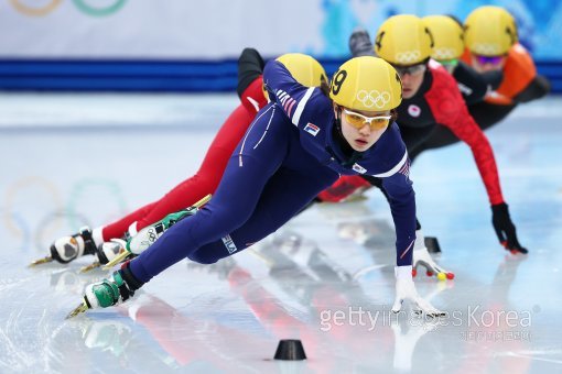 심석희(맨 앞)가 15일(한국시간) 러시아 소치의 아이스버그 스케이팅 팰리스에서 열린 2014 소치 동계올림픽 쇼트트랙 여자 1500m 준결승에서 역주하고 있다. 사진=GettyImages/멀티비츠