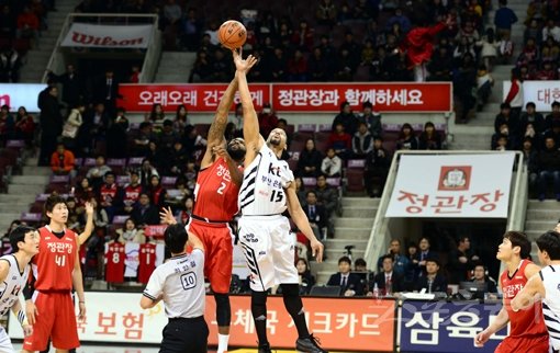 KBL(한국농구연맹)이 추진하는 12분 쿼터제가 결국은 보류될 전망이다. KBL의 밀실행정이 또 한번 도마에 오르게 됐다. 사진은 18일 안양체육관에서 열린 KGC-kt전의 점프볼 장면. 안양|김민성 기자 marineboy@donga.com 트위터 @bluemarine007