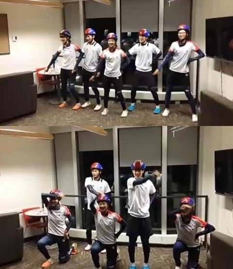 공개된 영상에는 쇼트트랙 국가대표 김아랑, 심석희, 공상정, 박세영, 신다운 등의 선수들이 ‘빠빠빠’ 무대를 펼치는 모습이 담겨 있다. 트레이닝복 차림의 선수들은 헬멧까지 써 크레용팝을 완벽 소화했다.