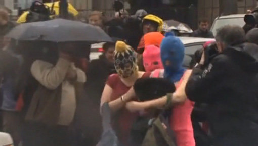 러시아 푸틴 대통령을 비하하는 공연으로 유명해진 여성 록밴드 푸시 라이엇이 절도 혐의로 체포됐다 풀려나고 있다. 사진출처|영국 텔레그래프 홈페이지 캡처