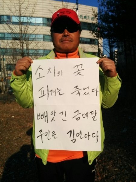 이는 러시아 소치 아이스버그 스케이팅 팰리스에서 열린 피겨스케이팅 여자 싱글 프리스케이팅의 결과에 분노를 표출한 것. 그가 준비한 피켓에는 ‘소치의 꽃 피겨는 죽었다. 빼앗긴 금메달 주인은 김연아다’라고 적혀 있었다.
