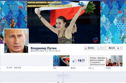 푸틴 러시아 대통령이 페이스북 커버 사진을 자국의 피겨선수 아델리나 소트니코바로 바꿨다.