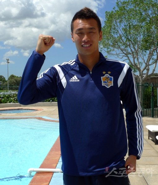 울산현대 김신욱이 24일 호주 시드니의 팀 호텔 앞에서 조민국 감독에게 프로 데뷔 승을 안겨드리겠다며 파이팅 포즈를 취하고 있다. 시드니(호주)|박상준 기자