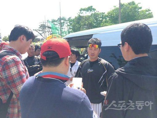 24일 한신의 스프링캠프지인 오키나와 기노자구장. 일본 취재진은 오승환이 등장하자 뜨거운 관심을 표현했다. 이곳에서 한국 미디어의 통역을 담당하는 김윤수(26) 씨는 “오승환과의 원활한 소통을 위해 한국어를 공부하는 일본 취재진도 있다”고 설명했다. 팬들의 반응도 달아오르고 있다. 이곳에서 팬들을 위한 한국어강좌가 열렸을 정도다. 오승환은 가볍게 수비훈련 등을 소화하며 25일 LG와의 연습경기 등판을 준비했다. 20일 자체 홍백전에서 던진 적은 있지만, 타팀과의 연습경기 출격은 이번이 처음이다.