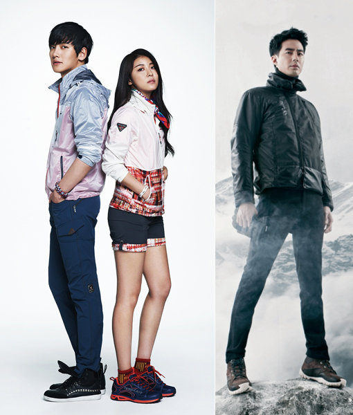 아웃도어 활동의 최적기인 봄을 맞아 아웃도어 브랜드들이 인기 스타모델을 앞세워 고객들의 눈길 사로잡기에 나섰다. 노스케이프의 모델 지창욱·하지원(왼쪽)과 지난해 ‘조인성 재킷’ 돌풍을 일으킨 블랙야크의 조인성. 사진제공|노스케이프·블랙야크