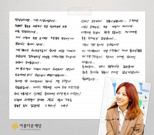 실제로 이효리는 직접 쓴 손편지와 함께 4만 7000원을 아름다운 재단에 보냈다. 이 사실은 온라인을 통해 전해지며 ‘노란봉투 프로젝트’ 참여 운동이 확산됐고, 당초 목표 금액임 4억 7000만 원은 빠른 속도로 채워지기 시작했다.