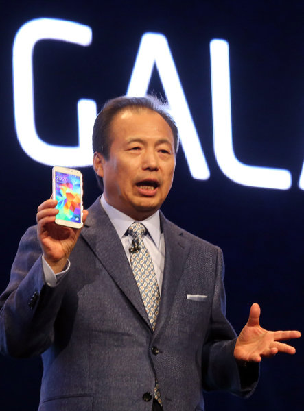 전 세계 2억 대 이상 판매된 삼성전자의 플래그십 ‘갤럭시S’ 시리즈의 다섯 번째 모델이 공개됐다. 삼성전자 신종균 사장이 24일(현지시간) 스페인 바르셀로나 컨벤션센터에서 열린 언팩행사에서 갤럭시S5에 대해 설명하고 있다. 사진제공|삼성전자