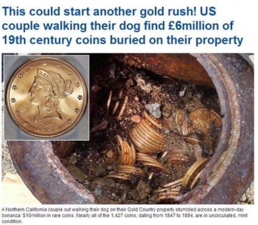 미국 ABC 방송은 최근 미국 캘리포니아 주 티뷰론에 거주하는 한 부부가 뒤뜰에서 1800년대에 주조된 금화를 무더기로 발견했다고 보도했다.