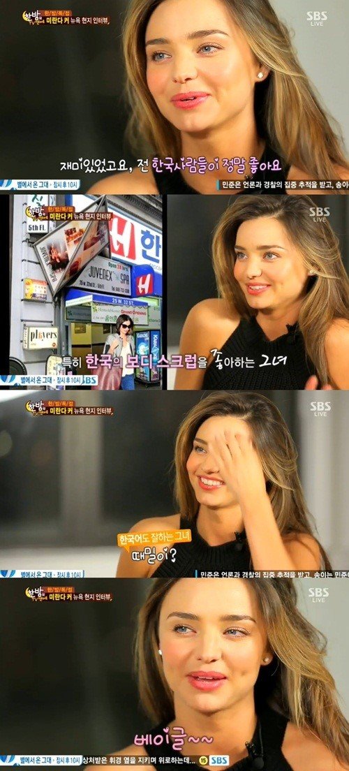 전 세계적으로 수많은 남성 팬을 거느리고 있는 톱모델 미란다 커가 연예 정보 프로그램에 출연해 한국에 대한 애정을 표현했다.