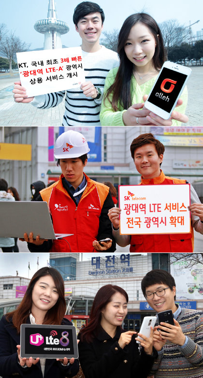 먼저 가장 빨리 광대역 LTE 서비스에 나섰던 KT는 3월1일부터 모든 광역시에서도 광대역 LTE 서비스를 이용할 수 있도록 했다. KT는 아울러 최고 속도 225Mbps의 광대역 LTE-A도 서울 및 수도권과 모든 광역시의 상용 네트워크에 적용한다고 밝혔다. 광대역 LTE-A를 지원하는 단말기가 출시되면 곧바로 기존 LTE보다 3배 빠른 네트워크를 경험할 수 있다는 설명이다.