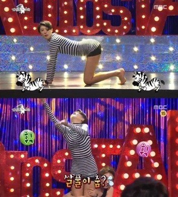 이날 홍진경은 선미에게 직접 공수해 온 줄무늬 바디 수트 의상을 입고 맨발 퍼포먼스를 선보였다.