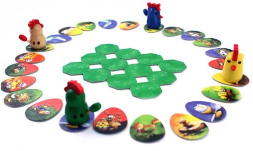 먼저 팔각형 모양의 타일을 그림이 보이지 않도록 뒤집어놓고, 그 바깥으로 달걀 모양 타일들을 둥그렇게 놓는다. 원하는 닭 말을 선택하고 달걀 모양 타일 위에 똑같은 간격으로 떨어뜨려 놓는다.