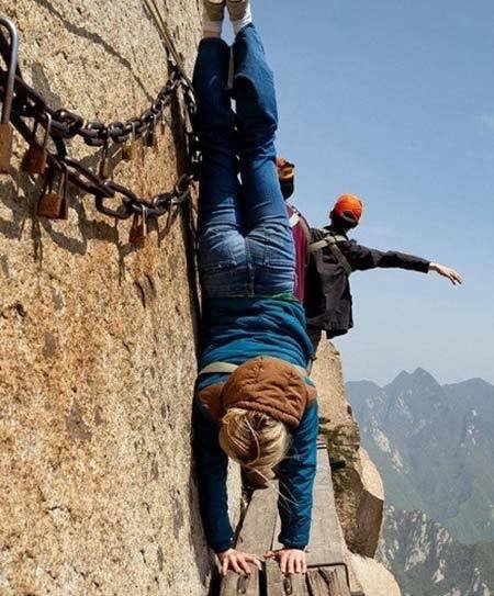 공개된 사진에는 한 여성 관광객이 안전 장비 없이 절벽에서 물구나무를 선 모습이 담겨 있다. 좁은 길 바로 옆에 깊은 낭떠러지가 있어 아찔함을 자아낸다.