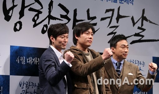 배우 정재영, 이성민, 감독 이정호(왼쪽부터)가 5일 오전 서울 강남구 압구정 CGV에서 열린 영화 방황하는 칼날 제작보고회에서 포토타임을 하고 있다.