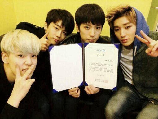 함께 공개된 사진에는 B.A.P 멤버들이 유니세프로부터 받은 감사장을 들고 포즈를 취하고 있는 모습이 담겨 있다.