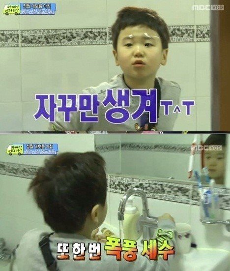 ‘아빠어디가’ 윤후가 자고 일어나니 하얗게 변해있는 눈썹에 놀라 울먹였다.