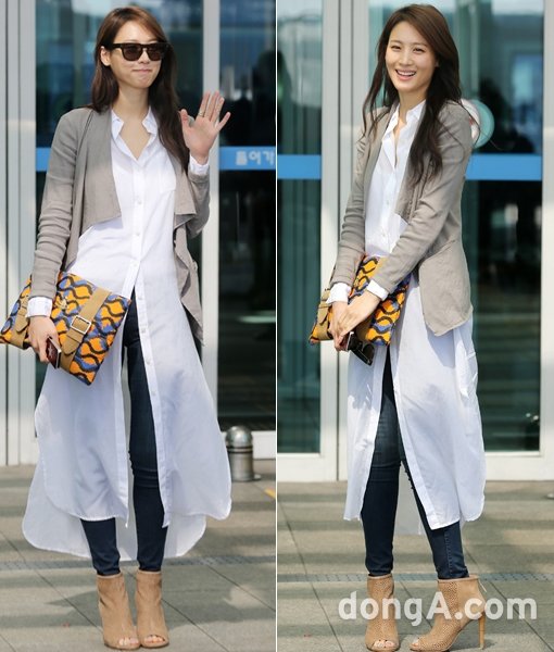이날 수현은 종아리까지 오는 길이의 화이트 셔츠과 청바지 차림으로 공항에 등장했다. 그는 회색 재킷과 누드 톤 힐로 시크한 매력을 더했고, 독특한 패턴의 클러치 백을 매치해 감각적인 패션을 완성했다.