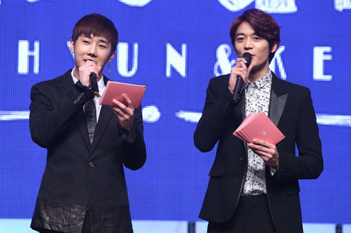 샤이니의 멤버 민호(오른쪽)와 인피니트의 멤버 성규가 10일 오후 서울 강남구 코엑스 아티움에서 열린 쇼케이스 무대에서 진행을 하고 있다.