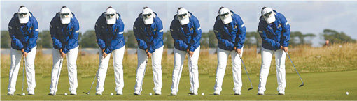 타고난 손재주와 뛰어난 감각은 거리를 조절하는 탁월한 능력으로 이어졌다. 거리를 계산할 때 발걸음으로 계산하지도 않는다. 오로지 눈으로 확인하고 감각에 의해서 퍼팅을 한다. 중요한 또 한 가지의 포인트는 그립을 쥘 때 힘의 세기다. 절대로 강하게 잡지 않는다. 10을 최대의 힘이라고 할 때 약 5정도의 힘으로 그립을 잡는다. 그래야 손의 감각을 제대로 느낄 수 있다.