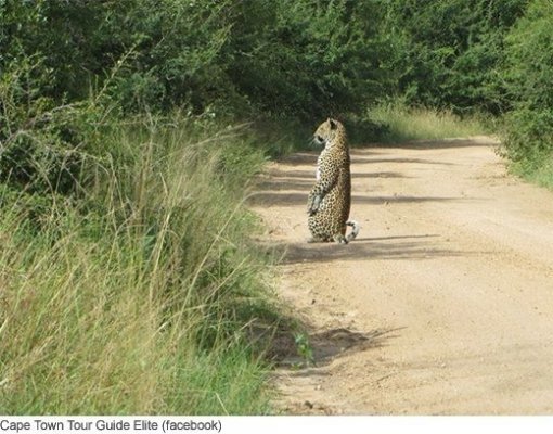 사진 속 표범은 미어캣처럼 앞발을 들고 어딘가를 응시하고 있다. 맹수라는 사실이 믿기지 않을 정도로 귀여운 자세가 눈길을 끈다.
