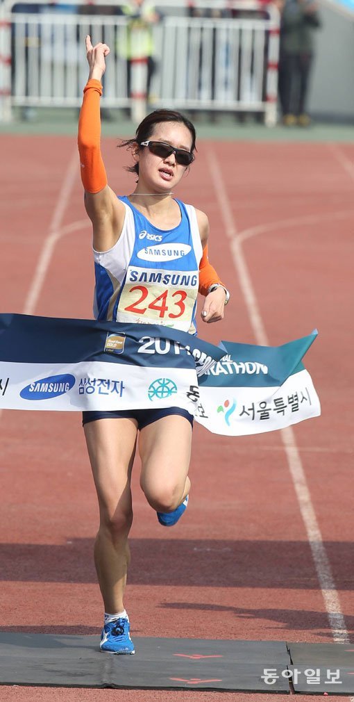 16일 열린 2014 서울국제마라톤대회 겸 제85회 동아마라톤대회에서 국내 여자부 1위 김성은(삼성전자)이 결승선을 통과하고 있다. 사진 | 동아일보 특별취재팀