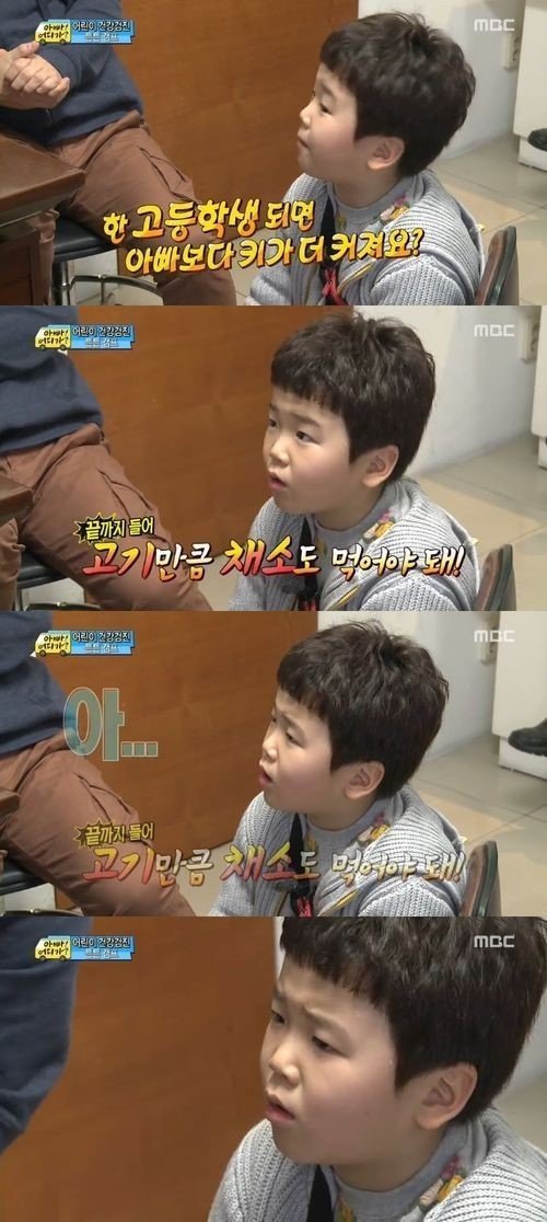 이에 윤후는 걱정이 된 듯 "건강식품을 먹고 이러면 고등학생 되면 아빠보다 커지냐"라고 질문했고 의사는 "고기를 먹어야 하는데, 고기만큼 채소를 먹어야 한다"라고 답했다.